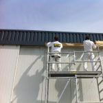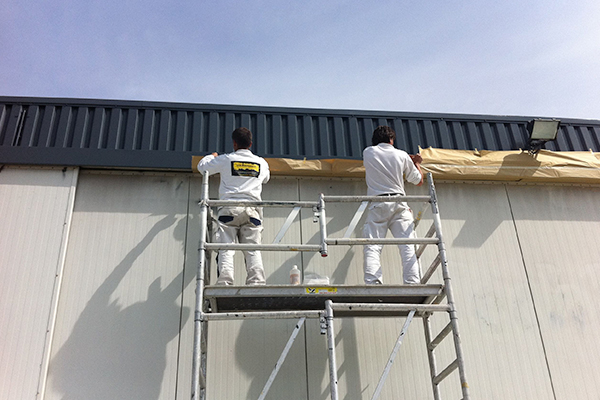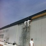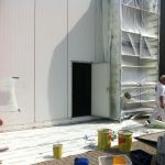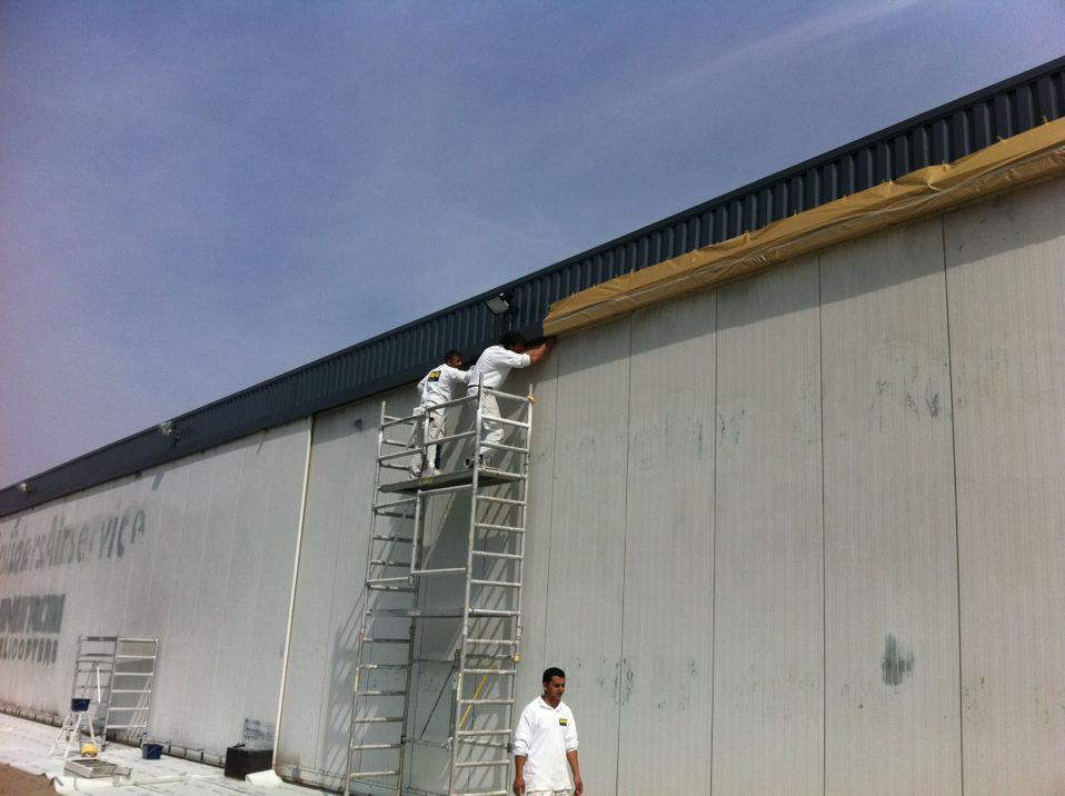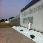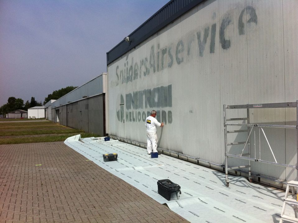 Spuiten van de deuren van een hangar op vliegveld Antwerpen.